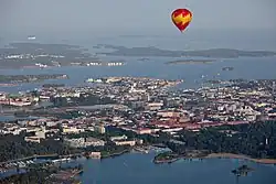 A hot air balloon is a lighter-than-air aircraft consisting of a bag, called an envelope, which contains heated air. Suspended beneath is a gondola or wicker basket (in some long-distance or high-altitude balloons, a capsule), which carries passengers and a source of heat, in most cases an open flame caused by burning liquid propane. The heated air inside the envelope makes it buoyant, since it has a lower density than the colder air outside the envelope. As with all aircraft, hot air balloons cannot fly beyond the atmosphere. The envelope does not have to be sealed at the bottom, since the air inside the envelope is at about the same pressure as the surrounding air. In modern sport balloons the envelope is generally made from nylon fabric, and the inlet of the balloon (closest to the burner flame) is made from a fire-resistant material such as Nomex. Modern balloons have been made in many shapes, such as rocket ships and the shapes of various commercial products, though the traditional shape is used for most non-commercial and many commercial applications.