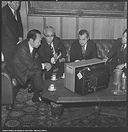 In September 1945, Ibuka founded a radio repair shop in the bombed out Shirokiya Department Store in Nihonbashi, Tokyo.[2][3] Morita saw a newspaper article about Ibuka's new venture and, after some correspondence, chose to join him in Tokyo. With funding from Morita's father, they co-founded Tokyo Tsushin Kogyo Kabushiki Kaisha (Tokyo Telecommunications Engineering Corporation, the forerunner of Sony Corporation) in 1946 with about 20 employees and initial capital of ¥190,000.[4][2]