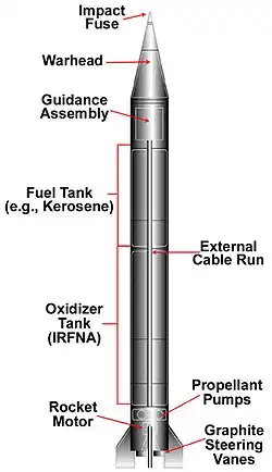 The missile fuel was common to every tactical missile of the Cold War: a mix of kerosene, ignited by a nitric acid oxidizer, called IRFNA. Each missile loaded 4,500 kg of liquid propellant, composed by a 22% of kerosene and 78% of IRFNA.[4]