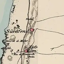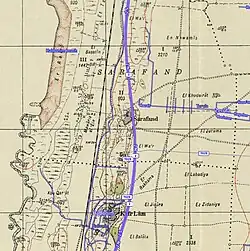 In 1799, it appeared as the village Sarfend on the map that Pierre Jacotin compiled that year.[14] In 1859 the village of Sarafand was described as being situated on a ridge between a plain and the beach. Consul Rogers estimated that 150 people lived in it and cultivated 16 faddans.[15][16] Four years later, Victor Guérin stated that the population size was not exceeding 300.[17]