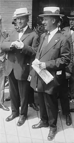 In 1924, Smith unsuccessfully sought the Democratic nomination for president, advancing the cause of civil liberty by decrying lynching and racial violence. Roosevelt delivered the nominating speech for Smith at the 1924 Democratic National Convention in which he saluted Smith as "the Happy Warrior of the political battlefield."[1] Smith represented the urban, east coast wing of the party as an anti-prohibition "wet" candidate, while his main rival for the nomination, President Woodrow Wilson's son-in-law William Gibbs McAdoo, a former Secretary of the Treasury, stood for the more rural tradition and prohibition "dry" candidacy.[24] The party was hopelessly split between the two. An increasingly chaotic convention balloted 100 times before both men accepted that neither would be able to win the required two-thirds of the votes, and so each withdrew. On the 103rd ballot, the exhausted party nominated the little-known candidate John W. Davis of West Virginia, a former congressman and United States Ambassador to Great Britain who had been a dark horse presidential candidate in 1920. Davis lost the election by a landslide to Republican incumbent Calvin Coolidge, who won in part because of the prosperous times.