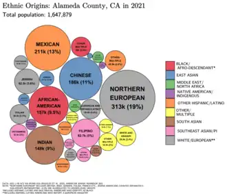 - ^ "B03002 HISPANIC OR LATINO ORIGIN BY RACE – Alameda County, California – 2018 American Community Survey 1-Year Estimates". U.S. Census Bureau. July 1, 2018. Retrieved January 28, 2020.
