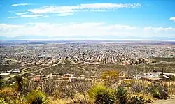As of 2010, Alamogordo had a total area of 19.3 square miles (50.0 km2), all land.[28] The city is located on the western flank of the Sacramento Mountains and on the eastern edge of the Tularosa Basin. It lies within the Rio Grande rift[29] and in the northernmost part of the Chihuahuan Desert.[30]: 36 Tectonic activity is low in the Tularosa Basin.[31] Plants native to the area are typical of the southern New Mexico foothills and include creosote bush, mesquite, saltbush, cottonwood, desert willow, and many species of cactus and yucca.[32]