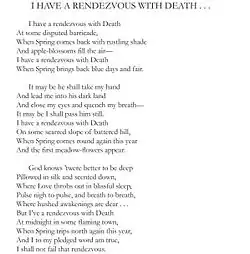 His most famous poem, "I Have a Rendezvous with Death", is believed to have been completed during a winter 1916 bivouac at Crevecoeur,[5] and was published posthumously.[14][22] It begins,