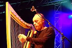 Alan Stivell (Breton pronunciation: [ˈɑːlãn 'sti:vəlː]; born Alan Cochevelou on 6 January 1944)[1] is a Breton and Celtic musician and singer, songwriter, recording artist, and master of the Celtic harp. From the early 1970s, he revived global interest in the Celtic (specifically Breton) harp and Celtic music as part of world music.[1] As a bagpiper and bombard player, he modernized traditional Breton music and singing in the Breton language. A precursor of Celtic rock, he is inspired by the union of the Celtic cultures and is a keeper of the Breton culture.
