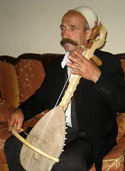 Lahuta is a one-stringed musical instrument with a long neck and oval shaped body. It consists of a sound box made of carved wood (usually maple as it is considered as the best material) covered with an animal skin, and a long neck which is decorated at the top, usually with the head of a goat, a ram or a horse.[34] The string of the Lahuta is made of horsehair. The instrument is held vertically between the knees, with the left hand fingers on the neck. It is played with a bow pulled over the string which is never pressed to the neck, creating a dramatic and sharp sound, expressive and difficult to master. In singing, the voice follows the harmonic and unique sound produced by the instrument.[36]