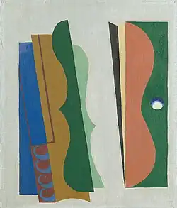During the 1940s Gallatin continued to exhibit his own paintings and organize exhibits of others. In 1942 he put together a show devoted to American women, including Morris's wife, Suzy Frelinghuysen, as well as Alice Trumbull Mason and Esphyr Slobodkina.[4] That same year New York University informed him that he had to close the Museum of Living Art so that the space it occupied could be repurposed as a wartime economy measure. Greatly disappointed, Gallatin accepted an offer from the Philadelphia Museum of Art to provide a home for it. Within a few months, 175 works from his collection were moved to Philadelphia and a few were donated to the Berkshire Museum in Pittsfield, Massachusetts, to which Morris and Frelinghuysen were connected.[4][52][53] During the remainder of the 1940s until his death in 1952, he continued to paint, promote, and collect non-objective art. In 1952 he was given a one-man retrospective exhibition at the Rose Fried Gallery, New York.[54] On his death he dispersed his remaining works of art to the New-York Historical Society, the Museum of the City of New York, the National Gallery of Art, and his two sisters.[55] At the end of his life the style of painting that he had championed was falling out of favor as abstract-expressionist art achieved its first critical recognition. Since that time it has regained critical attention and public appeal and is seen at least by some as influencing the minimalist and hard-edge artists who came into prominence in the 1960s[56] as well as younger artists such as Sarah Morris and Mai Braun.[57]