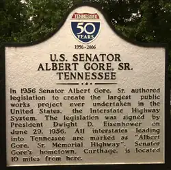 After leaving Congress, Gore Sr. resumed the practice of law and also taught law at Vanderbilt University. He continued to represent Occidental Petroleum, where he became vice president and member of the board of directors. Gore became chairman of Island Creek Coal Co., Lexington, Kentucky, an Occidental subsidiary, in 1972, and in his last years operated Gore Antique Mall, an antiques store in Carthage.[28] He lived to see his son Albert Gore Jr. become Vice President of the United States. Gore Sr. died on December 5, 1998, at the age of 90 and is buried in Smith County Memorial Gardens in Carthage. The Interstate Highway System in Tennessee is designated the "Senator Albert Gore Sr. Memorial Interstate System" in his honor.[6][29]