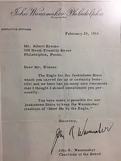2. ^ a b "Albert H. Krause". Philadelphia Daily News. 1961-11-02. Retrieved 2018-04-13 – via newspapers.com. He was a wood sculptor with studios at 500 N. Franklin St. He carved the eagle for John Wannamaker Jenkintown store. He is survived by a daughter, Mrs. Louis Vandetty, and four grandchildren.