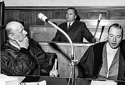 ![]() Albert Widmann (center) at his postwar trial, the Gaswagen-Prozess, in Stuttgart. | |