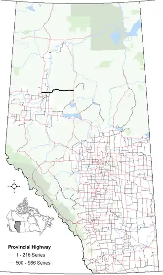 Highway 986 is an east-west highway in Northern Alberta. It spans approximately 158 km (98 mi) from Highway 35 (Mackenzie Highway) to Highway 88 (Bicentennial Highway).[1][2]