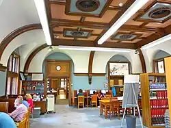 The library’s interior includes intricate oak wood, or similar woods stained to match. The first floor contains three fireplaces made of Italian marble. These seem to be used even though the library was built to be compatible with steam heat and electricity. The first floor contains mosaic Italian marble floors. A notable feature of the second floor are Mycenaean marble pillars that existed surrounding the original overlook into the circulation department. The original railing for this overlook was made of intricate wood designs.[18] During the winter of 1954 through 1955, renovations to the library closed the floor of the reference department.[19] Today, sections of the original railing are displayed on a wall in the Reference Section as decoration.