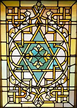 Stained glass windows can be seen in the reference and circulation departments of the Albright Memorial Library. Created by Edwin Ford and Frederick Brooks of Boston, the windows reflect important figures in the history of books through the book bindings they used.[18] Book bindings were designs used to designate a printmaker or owner of a certain work. Ford and Brooks used designs from printers, such as Stephanus Maillet, Sebastian Nivellius, and Melchoir Novesianus, for smaller windows. Designs appearing on books owned by famous patrons of the arts, such as Francis II of France, Queen Elizabeth I, and the arms of Constable Anne de Montmorency, are the basis for statement windows throughout the library.[23]