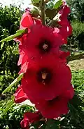 Alcea rosea, the common hollyhock, is an ornamental dicot flowering plant in the family Malvaceae. It was imported into Europe from southwestern China during, or possibly before, the 15th century.[2] William Turner, a herbalist of the time, gave it the name "holyoke" from which the English name derives.