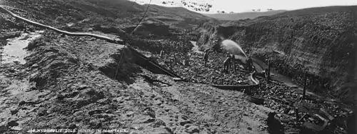 Alder Gulch (alternatively called Alder Creek) is a place in the Ruby River valley, in the U.S. state of Montana, where gold was discovered on May 26, 1863, by William Fairweather and a group of men including Barney Hughes, Thomas Cover, Henry Rodgers, Henry Edgar and Bill Sweeney who were returning to the gold fields of Grasshopper Creek, Bannack, Montana. They were on their way to Yellowstone Country from Bannack but were waylaid by a band of Crow Indians. After being ordered out of Crow hunting grounds, they crossed the East Slope of the Tobacco Root Mountains and camped for the night in Elk Park, where William "Bill" Fairweather and Henry Edgar discovered gold, while the remaining party was out hunting for meat. Agreeing to keep the new discovery quiet the group of miners returned to the town of Bannack for supplies. However, word leaked out about the new strike, and miners followed the Fairweather party out of town. The party stopped at the Point of Rocks, part way between Bannack and Alder Gulch, and established the Fairweather Mining District in a miners meeting. It was agreed that the discoverers were entitled to two claims and first choice. The first stampede of miners reached Alder Gulch June 6, 1863, and the population swelled to over 10,000 in less than 3 months. The "Fourteen Mile City" ran the length of the gulch, and included the towns of Junction City, Adobe Town, Nevada City, Central City, Virginia City, Montana, Bear Town, Highland, Pine Grove French Town, Hungry Hollow, and Summit. Upon arrival the miners lived in brush wickiups, dugouts and under overhanging rocks until cabins could be built. The first structure built in Virginia City was the Mechanical Bakery. Virginia City, and Nevada City were the centers of commerce during the height of the Alder Gulch gold rush. In the first year the area had over 10,000 people living there. Montana Territory was established in May 1864, and the first territorial capital was Bannack. The capital then moved to Virginia City, where it remained until 1875. The Alder Gulch diggings were the richest gold placer deposits ever discovered, and in three years $30,000,000 was taken from them, with $10,000,000 taken out in the first year. Nowadays, except during summertime, the streets of Virginia City are usually quiet and relatively few visitors find their way to the 16 ton granite monument that marks the spot of that incredible discovery of May 26, 1863.