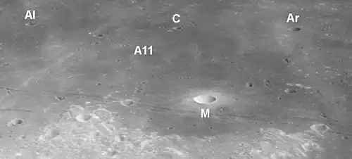 Aldrin is a small impact crater located on the southern part of the Mare Tranquillitatis, to the east of Sabine. It is located about 50 kilometers to the northwest of the Apollo 11 landing site, Tranquility Base. Named after Edwin Buzz Aldrin,[1] the crater is the westernmost of a row of three craters named in honor of the Apollo 11 crew members. About 30 kilometers to the east is the landing site of the Surveyor 5 lunar probe.