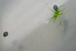 The actual traps consist of two lobes which fold together to form a snap-trap similar to that of the Venus flytrap, except that it is smaller and located underwater. These traps, which are twisted so that the trap openings point outward, are lined on the inside by a fine coating of trigger hairs, snapping shut in response to contact with aquatic invertebrates and trapping them. The closing of this trap takes 10–20 milliseconds,[9][10] making it one of the fastest examples of plant movement in the kingdom. This trapping is only possible in warm conditions of at least 20 °C (68 °F).[11] Each trap is surrounded by between four and six 6–8 millimetres (1⁄4–3⁄8 in) long bristles that prevent triggering of traps by debris in the water.