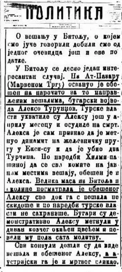 In the aftermath of the Ilinden Uprising (1903) the Ottomans persecuted Exarchists.[6] At Aetos, a village of the Florina area, an Orthodox notable Nikolaos Vannis and the village priest Papa Alexis conspired with Ottoman authorities to trap Turundzhev, a figure hostile to the Patriarchist cause.[6] Turundzhev was arrested on 6 April 1904 by Ottoman soldiers at the home of Vannis.[6] Local Patriarchists received the news of his capture with relief.[6] In Monastir (modern Bitola) Turundzhev was imprisoned for over a year and later hanged on 12 September 1905 at the town marketplace.[6] According to the British Consul in Thessaloniki, Robert Graves, the same day several thousand citizens followed the coffin, which was covered with wreaths from the Bulgarian Church congregation.[7] His grave is in the cemeteries Saint Nedela in Bitola, North Macedonia.[8]