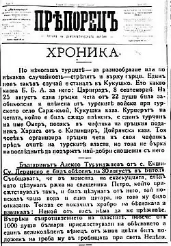 - ^ "Correspondence of Daily telegraph concerning the fights during the first days of Ilinden-Preobrazhenie Uprising, Thessalonica, 13 August 1903". Archived from the original on 3 March 2016. Retrieved 11 November 2012.