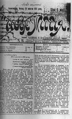 The press published in Internment Camp No. 6 was prepared by cultural and educational sections operating within the various divisions from which the soldiers originated and later by cultural societies established within the camp. This activity was highly praised by the Ukrainian camp commanders. The newspapers were intended primarily to boost the morale of the internees, offering articles on the latest events related to the Ukrainian struggle for independence. They were also used as a tool for teaching literacy.[23] Most camp newspapers were printed on duplicating machines, with print runs not exceeding 50 copies. Editors did not receive any remuneration for their work; the papers, in addition to original content, also reprinted articles from Polish periodicals or those from the territory of the Ukrainian People's Republic.[24] The publications were subject to both external and internal censorship.[25]