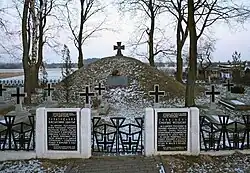 A cemetery was established on the grounds adjacent to the camp for 17 internees who died during their stay. It featured a memorial kurgan with a Zaporizhian cross and a plaque in Ukrainian. The identities of the buried are unknown due to significant post-World War II destruction of the cemetery.[37]