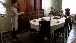 In the centre of the dining room is a large dining table. Each member of the family had their own crockery, which is on display in the exhibition. The interior is completed by an antique clock with a pendulum, a lomber table, a sideboard, a bookcase where books on chemistry are next to works on local history, history and fiction (all the books in the bookcase have gift inscriptions from the authors to Aleksandr Arbuzov),[78] as well as indoor flowers tended by Ekaterina Arbuzova.[22] In the dining room there is an oven with a stove. During the Second World War the family of the academician lived in this room.[78]