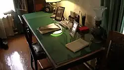 The living room and at the same time the study of Aleksandr Arbuzov[Notes 4][50] was a place of evening gatherings of the whole family of the academician.[35] Aleksandr Arbuzov had no separate office. In the living room, near the door, there is a massive desk, at which he and engaged in household chores. The academician believed that the pursuit of science should be limited to working hours and the laboratory, while the house, in his opinion, existed for recreation.[16] He said:[16]