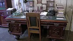 In the spacious room there is a massive oak desk. On it are a lamp with a silk lampshade, a writing utensil, a paperweight, a telephone and photographs of loved ones, as well as a sculpture of Venus that belonged to the scientist. The room contains a trundle bed and a bookshelf with reference books.[35] The interior of the room also includes a sofa, armchairs, a coffee table, a desk of Aleksandr Arbuzov's wife Ekaterina Petrovna, an antique chandelier and lamps.[55] The shelves are lined with sheet music, gramophone records and albums. An important place in the interior is occupied by an antique clock with a British chime.[59]