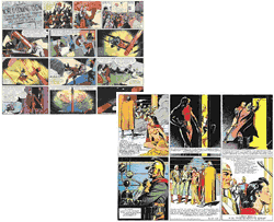Raymond's sensual artwork—for which the artist particularly "studied popular illustrators," including pulp artist Matt Clark, whose work Raymond's male figures particularly evoke[12]—outshone its borders and "attracted far more loyal readers than ... [the] rather contrived and unconvincing adventure stories" his work depicted.[14] Raymond swiftly became "among the most highly-regarded—and most imitated—in all of comics" for his work on the weekly strip, with Harvey declaring his work on the strip "a technical virtuosity matched on the comics pages only by Harold Foster in Prince Valiant."[14][17] Raymond evolved the layout of the strip from a four-tier strip in 1934 to a two-tier strip in 1936, reducing the number of panels but doubling their size. Combining this with a removal of dialogue from speech balloons to captions at the bottom of the panel afforded Raymond the space to create detailed and atmospheric backgrounds. Against these spacious backgrounds, the placement of characters in heroic poses "lent the entire enterprise a mythic air."[17]