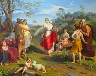 Bruckmann was born at Reutlingen in 1806.[1] From 1826 he studied painting under Georg Friedrich Eberhard at Stuttgart, and in 1827–29 he studied at Munich, mostly under Heinrich von Hess. From the autumn of 1829 until 1832 he lived in Rome, where he painted Barbarossa's Body Drawn out of the Calycadnus (Staatsgallerie Stuttgart), which he sent back to Germany. He spent the years 1833–39 back in Munich.[2] In 1833 he painted fourteen pictures at the royal palace at Munich, showing subjects from the poems of Theocritus, partly from his own designs, and partly from those of Hess.[1] Some of his most notable easel paintings, such as the Women of Weinsberg (Staatsgallerie, Stuttgart ), and The Maiden from Afar (from Schiller's "Das Madchen aus der Fremde"), are from this time.[2][1]