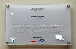 A plaque commemorating Alexander Chalmers is placed on the elevation of the Shoemakers Tenement building in Warsaw, located at 10 Wąski Dunaj Street, at the corner with Szeroki Dunaj Street. The building used to be owned by Chalmers. The plaque was unveiled on 16 November 2008, by Linda Fabiani, Minister for Europe, External Affairs, and Culture of the Scottish Parliament. Around thirty people attended the ceremony.[5]