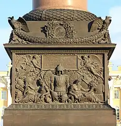 The pedestal of the Alexander Column is decorated with symbols of military glory, sculpted by Giovanni Battista Scotti.