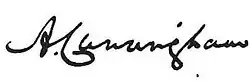 Two of Cunningham's brothers, Francis and Joseph, became well known for their work in British India; while another, Peter, became famous for his Handbook of London (1849).[19] Cunningham married Alicia Maria Whish, daughter of Martin Whish, B.C.S., on 30 March 1840. The couple had two sons, Lieutenant-Colonel Allan J. C. Cunningham (1842–1928) of the Bengal and Royal Engineers, and Sir Alexander F. D. Cunningham (1852–1935) of the Indian Civil Service.[1] Cunningham died on 28 November 1893, at his home in South Kensington and was buried at Kensal Green Cemetery, London. His wife predeceased him, in 1870. He was survived by his two sons.[1]