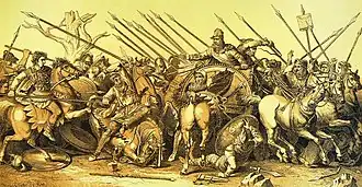 It is typically dated between c. 120 and BC 100[1] and depicts a battle between the armies of Alexander the Great and Darius III of Persia.[2] This work of art is a combination of different artistic traditions such as Italic, Hellenistic, and Roman. The mosaic is considered Roman based on the broader context of its time and location in relation to the later Roman Republic.[1] The original is preserved in the National Archaeological Museum, Naples. The mosaic is believed to be a copy of a late 4th or early 3rd-century BC Hellenistic painting, perhaps by Philoxenus of Eretria or Apelles.[3]