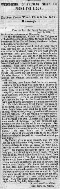 15. ^ The Chippewa Embassy, The Weekly Pioneer and Democrat Vol. XIV, No.14, Sept. 19, 1862, p.5, Chronicling America, Library of Congress, 2023 [4]