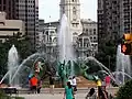 | Swann Memorial Fountain[34] (Fountain of Three Rivers) | 1920–1924 | Logan Circle, Philadelphia, Pennsylvania 39°57′29″N 75°10′15″W / 39.95795°N 75.170819°W | bronze | Central figures: 11 ft (3.4 m) | The female allegorical figures represent the Schuylkill River and the Wissahickon Creek. The male Lenni Lenape figure represents the Delaware River. | |