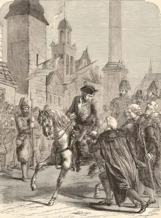 Then, Alexander served under the command of General-Major Maxim Berg. Suvorov successfully defended his positions at Reichenbach, but contrary to his future rules did not pursue the retreating enemy, if the only surviving account of this action is accurate. At the skirmish of Schweidnitz, in a third assault, Suvorov managed to take the hill occupied by the hussar picket; in this clash 60 Cossacks opposed 100 hussars.[31] For another example, in the combat of Landsberg on 15 September 1761, his Cossack-hussar cavalry unit defeated 3 squadrons of the Prussian hussars.[32] On leaving the Friedberg Forest, he hit General Platen's side units and took many prisoners.[31] He also fought minor battles at Bunzelwitz, Birstein, Weisentine,[d] Költsch, and seized the small fortified town of Golnau.[33] After repeatedly distinguishing himself in battle Suvorov will become a colonel in 1762, aged around 33.[34] Soon afterwards, following the capture of Golnau, he was given temporary command of the Tver Dragoon Regiment until the regimental commander recovered. Prussian observation detachments had spread far from Kolberg; Berg moved there in two columns, the left he led himself, and the right, which consisted of three Hussar, two Cossack, and Tver Dragoon regiments, he entrusted to Suvorov. In the village of Naugard[e] the Prussians positioned themselves with 2 battalions of infantry and a weak dragoon regiment. Forming his unit in two lines, Suvorov began the attack. He felled the dragoons, struck one of the battalions, killed many on the spot and took at least a hundred prisoners. At Stargard, Suvorov attacked the rearguard of Platen, during which Suvorov cut into the enemy cavalry and infantry, and it was reported that "many were taken and beaten from the enemy".[35] Suvorov managed to avoid heavy losses.[33] All the battles described took place at the same time as the siege of Kolberg (1761) in Pomerania.