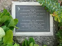 In November 1887, the Empress commissioned Warsberg to find a suitable plot of land for a villa on Corfu. Warsberg, who was now seriously ill, managed to acquire the Villa Braila for the Empress and purchased additional land on Corfu for the construction of the villa. He created the "spiritual concept" for the palace, called Achilleion, but did not live to see the completion of it in 1891. After his death, his brother Gustav took over the construction management for a short time.[2][3]