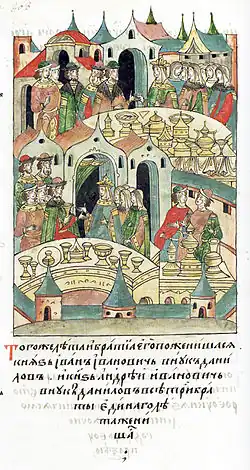 ![]() Wedding of Ivan and Alexandra, miniature from the Illustrated Chronicle of Ivan the Terrible | |||||