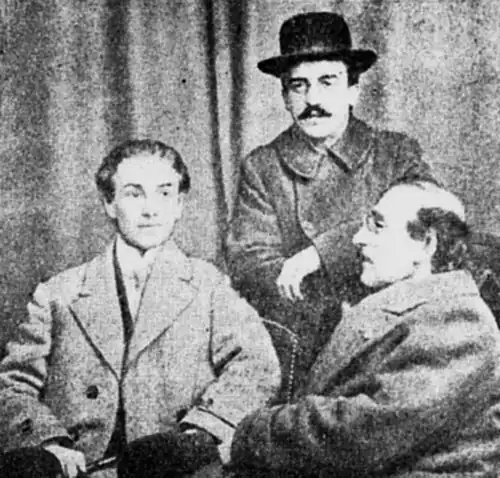 In his article of 1903, titled Spre ocultism. Orientări ulterioare spre teozofie și filozofie socială ("Toward Occultism. Later Orientations toward Theosophy and Social Philosophy"), the poet envisaged making his interest in esoteric subjects the basis of a new literary movement.[157] Also that year, poet George Bacovia began attending the literary circle, and gave a reading of his celebrated Plumb poem, being welcomed by Macedonski with a flattering epigram.[158] Macedonski's series of short-lived periodicals resumed in 1905, when he founded Le Beau Danube Bleu (French for "The Beautiful Blue Danube") and Liga Conservatoare ("The Conservative League").[159] He registered more success in 1906, when his Thalassa was published, as Le Calvaire de feu, by Edward Sansot's Paris-based publishing house.[127][160] This followed intense self-promotion within the French literary environment, as well as advertisements in the French press.[24][161] Part of this involved Macedonski sending his book to be reviewed by Émile Faguet, Jean Mounet-Sully, Joséphin Péladan, Pierre Quillard and Jean Richepin, who replied with what Vianu deems "the politeness of circumstance."[162] The volume was nonetheless favorably reviewed by the prestigious magazines Mercure de France and Gil Blas.[163]