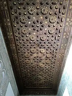 Alfarje (meaning "paneled ceiling" in Spanish) is a type of horizontal wooden ceiling primarily found in Islamic (or Moorish) architecture[1] and Mudéjar architecture.[2] The word derives from Andalusi Arabic al-farsh, meaning "bed", related to Classical Arabic farsh (فرش), meaning "tapestry".[3] The ceiling structure is made through a series of beams called girders, sometimes intricately carved and stylized with geometric patterns.[4] Typically, such ceilings are employed when they support a floor above that can be walked on.[5]