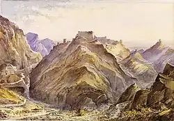 In May 1879, the Khyber Pass was ceded to British control by the Treaty of Gandamak, after which the fort was within the British Raj.[5] The British then established their own fort on the site, commanding a strategic view over the Khyber Pass. The fort has a small cemetery which contains the graves of British soldiers who fell in the second Afghan War. The valley walls bear insignias of regiments that have served here.[1] The Ali Masjid Mosque is also mentioned in the book Tuzk-i Babur, written by the first king of the Mughal Empire when he captured Kabul in 1505. After that, he travelled to India through the Khyber Pass and stayed at the masjid, later travelling to Peshawar.
