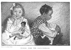 Another interesting aspect of Winter's suffrage art is her inclusion of black children as well, which was rare for the time. Even though these people of color were not necessarily included in positions of authority or power, it was still a landmark change and step forward in this genre of art. Her work Puzzle: Find the Race-Problem, for example, shows a black child and a white child playing together with dolls of opposite skin color.[3]