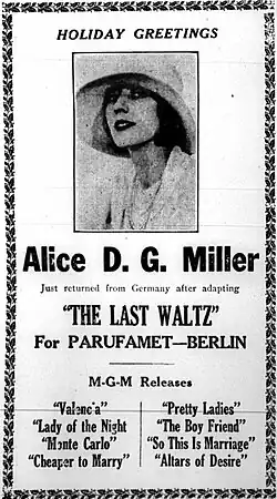 Alice D. G. Miller (June 28, 1894 โ July 24, 1985) was an early American screenwriter. She was sometimes erroneously credited as Alice Duer Miller, another writer of no relation.[1][2][3]