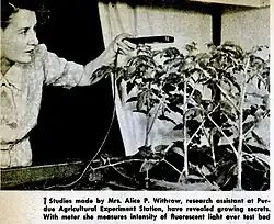 During World War II Withrow and her husband were consulting scientists for the U.S. Air Force on the problem of growing plants without soil, in part so that the military could "grow perishable vegetables on sandy bases in the Pacific."[2] In May 1945 Withrow was preparing hydroponics kits for shipment to Canton Island, Espiritu and Ascension Island, with later installations planned for Port Moresby and Karachi.[11] A 2006 timeline of the history of hydroponic growing credited Withrow and her husband with introducing "inert gravel" as a growing medium, and noted that in 1945 the Air Force constructed a hydroponic farm on Wake Island that produced tomatoes, string beans, sweet corn and lettuce.[12] In late 1945 she lectured in Chicago on "soil-less culture and the effect of various spectrum colors on the growth rate of plants."[13] After the war, the Withrows published a paper comparing the use of mercury, incandescent and the new fluorescent lamps for growing plants.[14] The Withrows' research was featured in the science magazine Popular Mechanics in October 1946.[15]