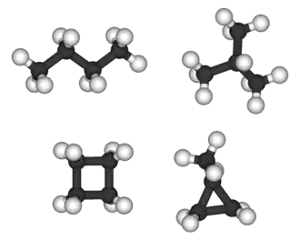 Branched alkanes can be chiral. For example, 3-methylhexane and its higher homologues are chiral due to their stereogenic center at carbon atom number 3. The above list only includes differences of connectivity, not stereochemistry. In addition to the alkane isomers, the chain of carbon atoms may form one or more rings. Such compounds are called cycloalkanes, and are also excluded from the above list because changing the number of rings changes the molecular formula. For example, cyclobutane and methylcyclopropane are isomers of each other (C4H8), but are not isomers of butane (C4H10).