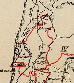 Profile The district of Alkmaar in 1888 The electoral district of Alkmaar was centred around the city of Alkmaar in North Holland . After a brief period with provisional boundaries, the two-seat district created in 1850 stretched along much of the west coast of North Holland, from Den Helder and three Frisian Islands in the north to the North Sea Canal and Zaandam in the south. Minor boundary revisions in 1858, 1864, 1869 and 1878 transferred some municipalities in the south, including Zaandam in 1864, to the district of Haarlem, while it (re)gained some rural areas east of Alkmaar, some of which had been part of the district in the 1848–1850 period, at the expense of the Hoorn district. Alkmaar shrank considerably in the 1888 revision, which changed the district to a single-seat district, with most of its northern and southern areas ceded to the newly created districts of Den Helder and Beverwijk , respectively. It retained these boundaries until the district was abolished in 1918.[ 1] [ 2] [ 3]