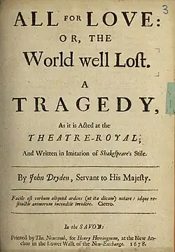 All for Love; or, the World Well Lost, is a 1677 heroic drama by John Dryden which is now his best-known and most performed play. It is dedicated to Earl of Danby. It is a tragedy written in blank verse and is an attempt on Dryden's part to reinvigorate serious drama. It is an acknowledged imitation of Shakespeare’s Antony and Cleopatra, and focuses on the last hours of the lives of its hero and heroine.[1]