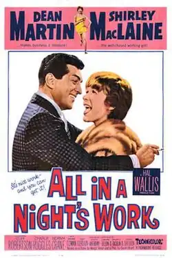 All in a Night's Work is a 1961 American Technicolor romantic screwball comedy film directed by Joseph Anthony and starring Dean Martin and Shirley MacLaine.[2]