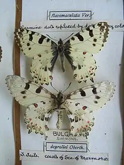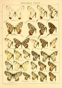 T. cerisyi God. (9d). Closely resembling in colour and pattern the male of Sericinus, being like this spotted with black on a pale yellow ground, the hindwing bearing traces of red near the middle of the costal margin and at the anal angle. Hindwing with only one strongly prominent tooth. Balcan States, Greece and Asia Minor; not so common as polyxena, occurring from April till early June, being still earlier in the southern districts. — The female varies very much ; specimens which are very strongly spotted with black are sold by dealers as ab. obscurior (9d), in albidior (9e) the ground-colour is white, in ochracea (9e) bright yellow, and in pallidior (9d) fallow; in ab. flavomaculata Verity the carmine dots are replaced by dots of honey-colour; all these aberrations occur together with ordinary cerisyi. — caucasica Led.[now species Allancastria caucasica (9e) has in both sexes very large, broad, black costal spots on the forewing, the hindwing being sUghtly and almost evenly scalloped, the middle tooth hardly projecting; in Armenia. — deyrollei Oberth.[ now species Allancastria deyrollei] (9d) has the three teeth before the anal angle of the hindwing prolonged into short tails; in the coast districts of the Black Sea, in the whole of Asia Minor, southward to Syria; extremely common, in some places appealing in enormous numbers. — cretica Reb. (9e) [now species Allancastria cretica] occurs on Crete and some Greek islands; a sparsely marked form in which the three teeth of the hindwing mentioned above are indicated only by black curved lines, the edge of the wing not being distinctly excised. Not so common as the preceding. — Larva yellow, brown or reddish, the tubercles being red; from May till July, on Aristolochia. Pupa dust-colour or yellowish grey, variegated with thin black dashes, especially on the head. — The buttertlies are on the wing on the first warm days of the year at rocky places and the edges of woods. [1]